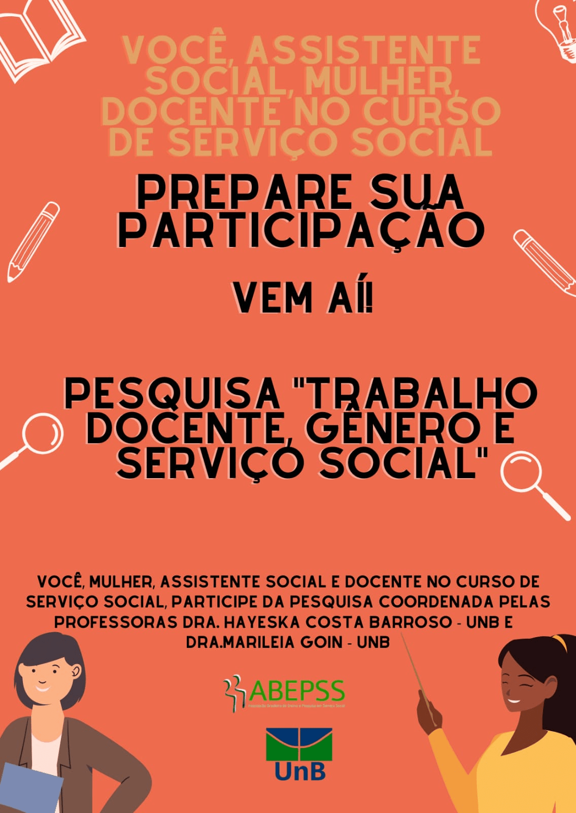 a convidamos para contribuir com a pesquisa “Trabalho Docente, Gênero e Serviço Social", desenvolvida pelos Grupo de Estudos e Pesquisas sobre Maternidades, Parentalidade e Sociedade (GMATER) e pelo Grupo de Estudos e Pesquisas sobre Fundamentos do Serviço Social e América Latina (GFAL), ambos da UnB, em parceria com a Associação Brasileira de Ensino e Pesquisa em Serviço Social - ABEPSS, cujo objetivo é apreender como a interface entre Serviço Social, docência no ensino superior, trabalho feminino e maternidade se expressa na realidade das professoras assistentes sociais nos cursos de Serviço Social, no Brasil.